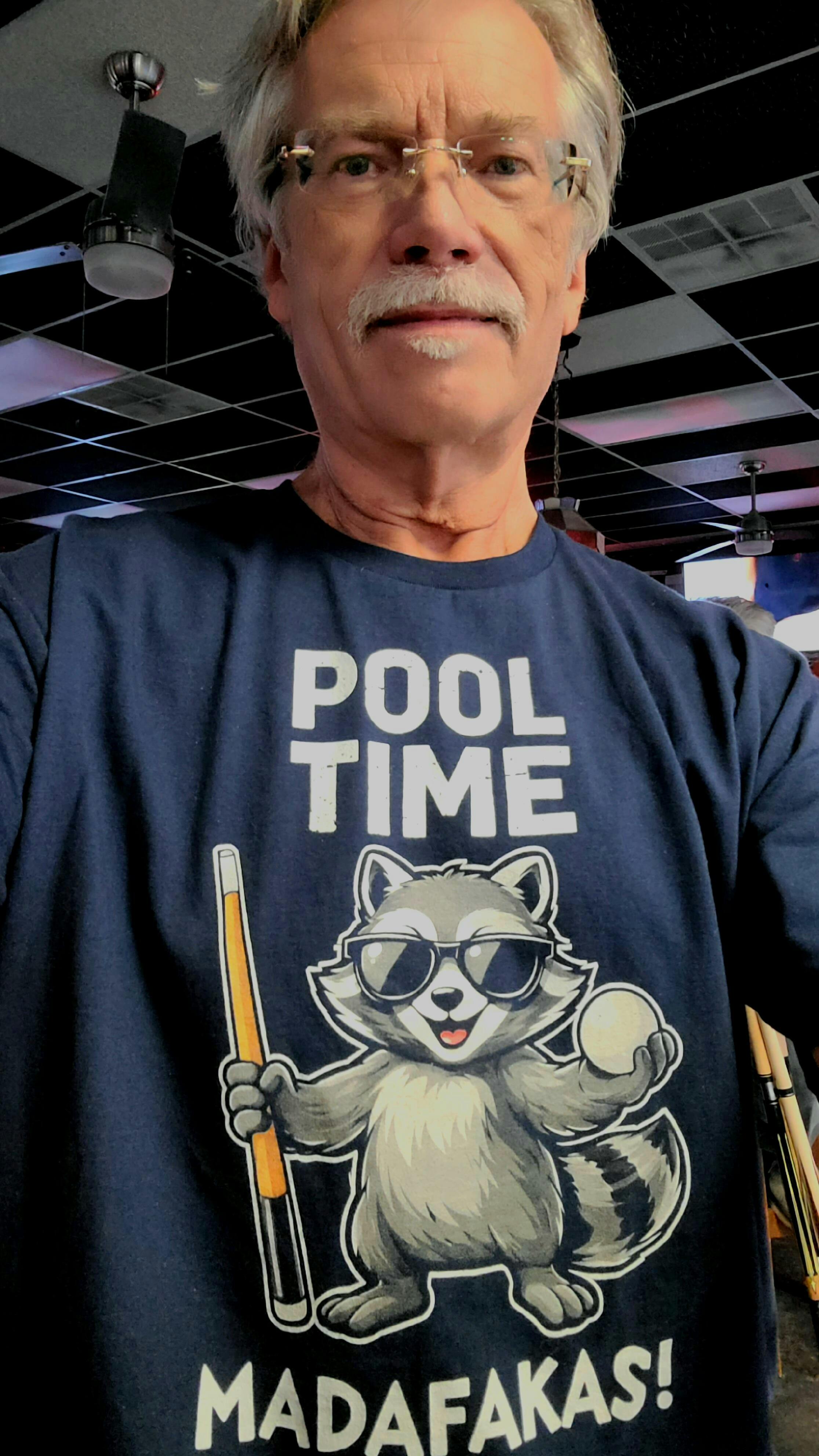 Pool time is not a suggestion. It is a way of life. This graphic tee features a bold, attitude-packed raccoon rocking sunglasses, holding a pool cue in one hand and a cue ball in the other. Fun, confident, and unapologetic. Perfect for players who take their table time seriously and their trash talk lightly.